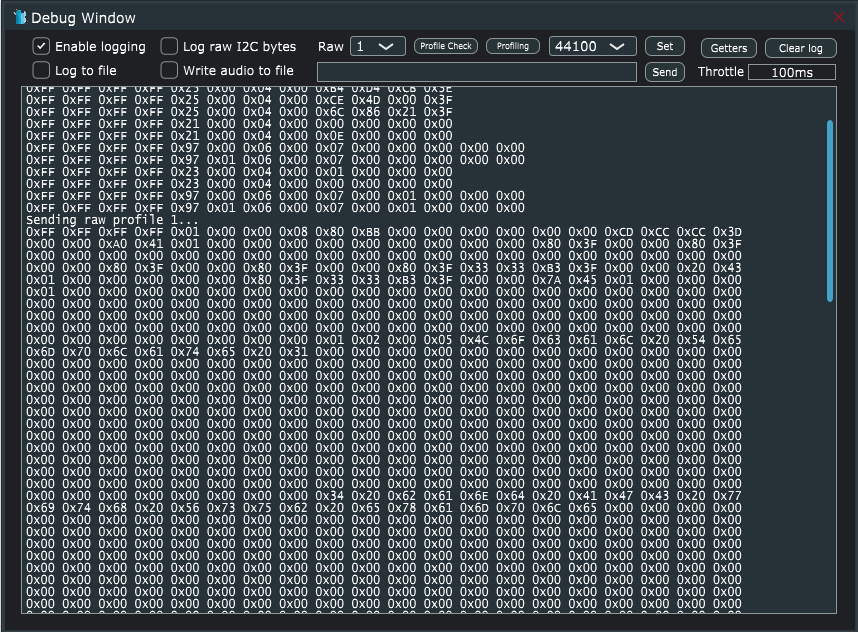 - Enable logging – Starts writing Tx and Rx bytes to the debug window.