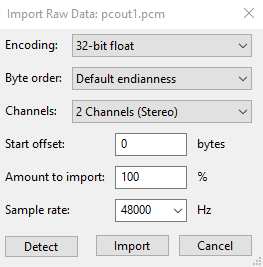 - The audio may be imported into Audacity as Raw data using the following settings:
