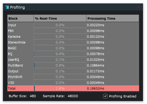 - Profiling – Provides CPU use of the algorithm on the target platform (if supported). The processing time of each component is provided in milliseconds. The percentage of real-time is calculated based on the sample rate and buffer size.
